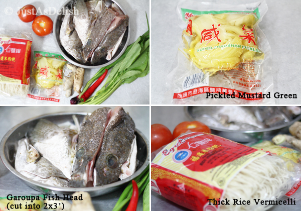 - Garnish with tomatoes, pickled mustard green, green onions and choy sum. Serve with the soy sauce mixed with chopped bird’s eye chillies or red chillis.[br][url href=”http://www.justasdelish.com/wp-content/uploads/2013/07/FishHeadNoodleSoup9.jpg”][img src=”http://www.justasdelish.com/wp-content/uploads/2013/07/FishHeadNoodleSoup9.jpg” alt=”Fish Head Noodle Soup” width=”220″ height=”146″ class=”alignnone size-full wp-image-6773″][/url]